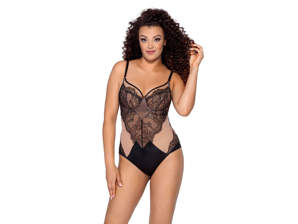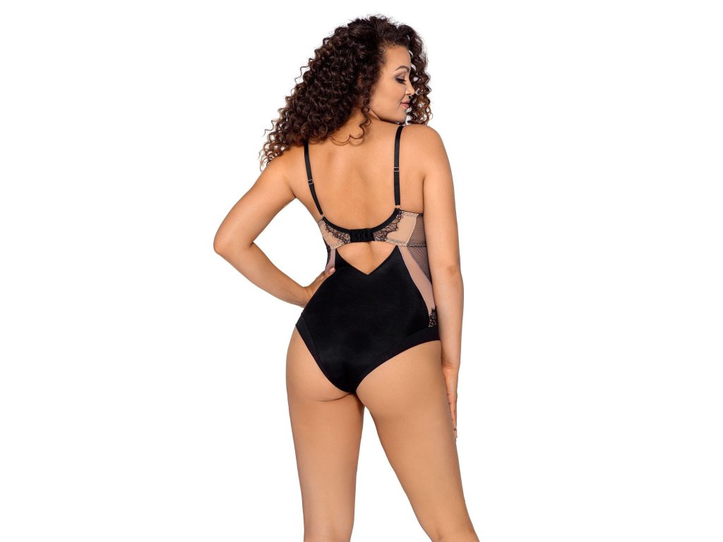 Elegantní dámské body.Body je vyrobené z efektní ažurové krajky a pružné síťoviny. Přední i zadní díl modelu jsou částečně podšité béžovým tylem. Měkké košíčky mají kostice. Ramínka je možné nastavit, ale nelze je odepnout. Model má v rozkroku pohodlné zapínání na patentky. Body ideálně přiléhá k tělu.