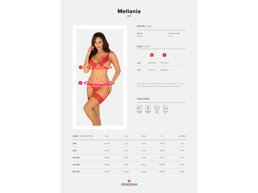 Sada MellaniaJste připraveni na velmi dlouhou a žhavou noc ve své ložnici? Pokud ano, nezapomeňte si s sebou vzít tuto super sexy soupravu z kolekce Mellania. Pikantní střihy a odvážný styl vám umožní naplnit vaše nejniternější touhy a šťavnatá červená barva rozpaluje smysly! Efektní krajka dodává eleganci a jemně obepíná tělo a kalhotky s otevřeným rozkrokem posouvají nezbedné hrátky na mnohem vyšší úroveň!