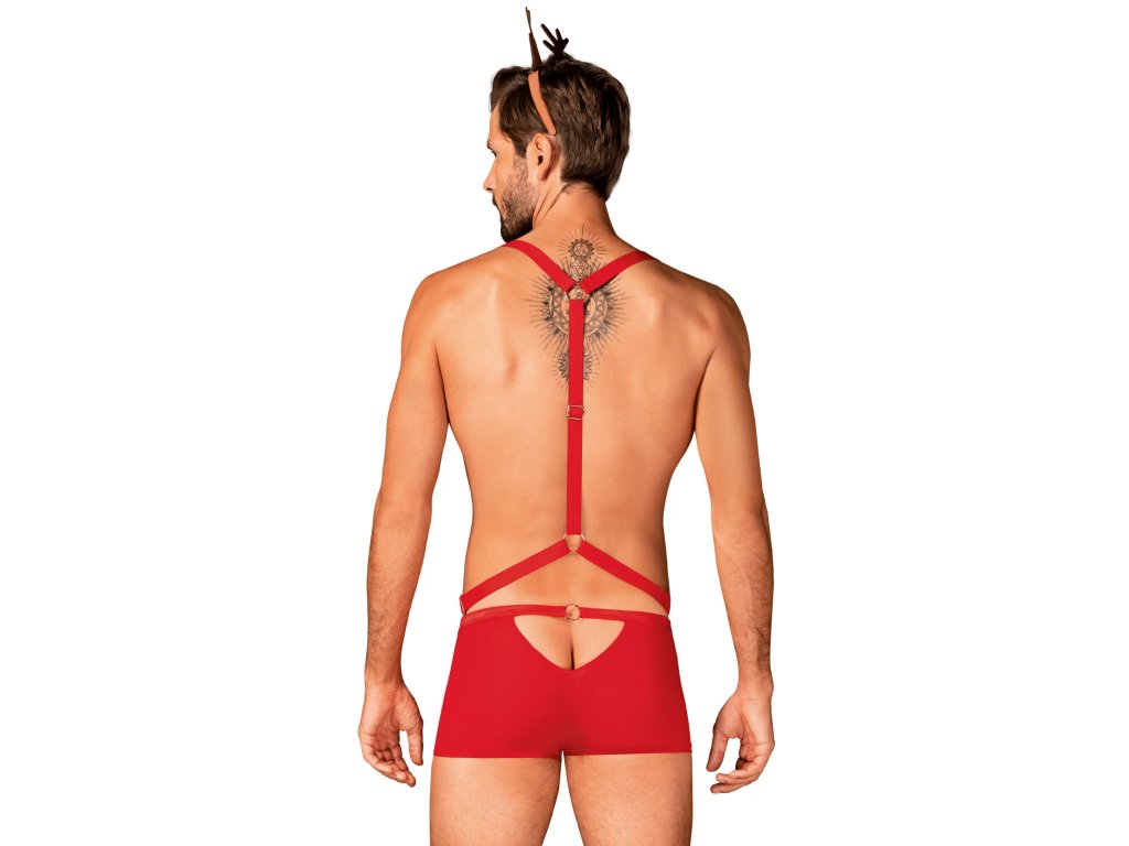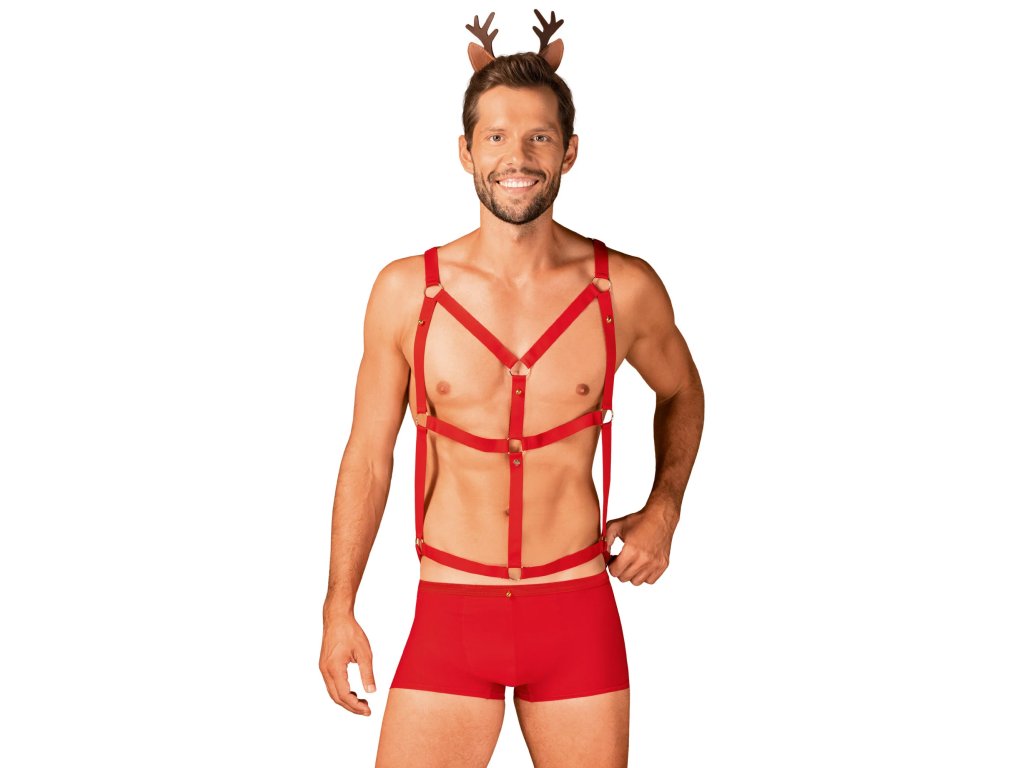 Souprava Mr ReindyHravý Mr Reindy má náladu na zábavu! Pikantní červený postroj a svůdné boxerky tvoří velmi sexy a smyslnou dvojici, která je připravena na rošťárny v ložnici. Čelenka se sobími oušky je mimořádně okouzlujícím prvkem, který celek dokonale doplňuje.