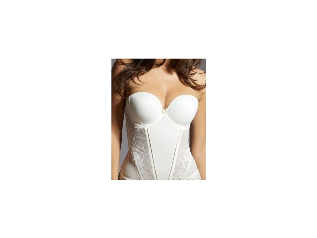 Svůdný korzet kombinuje hladký materiál a rafinovanou krajku. Košíčky korzetu jsou vyztužené a bez ramínek. Korzet má také podvazkové přichycení punčoch.