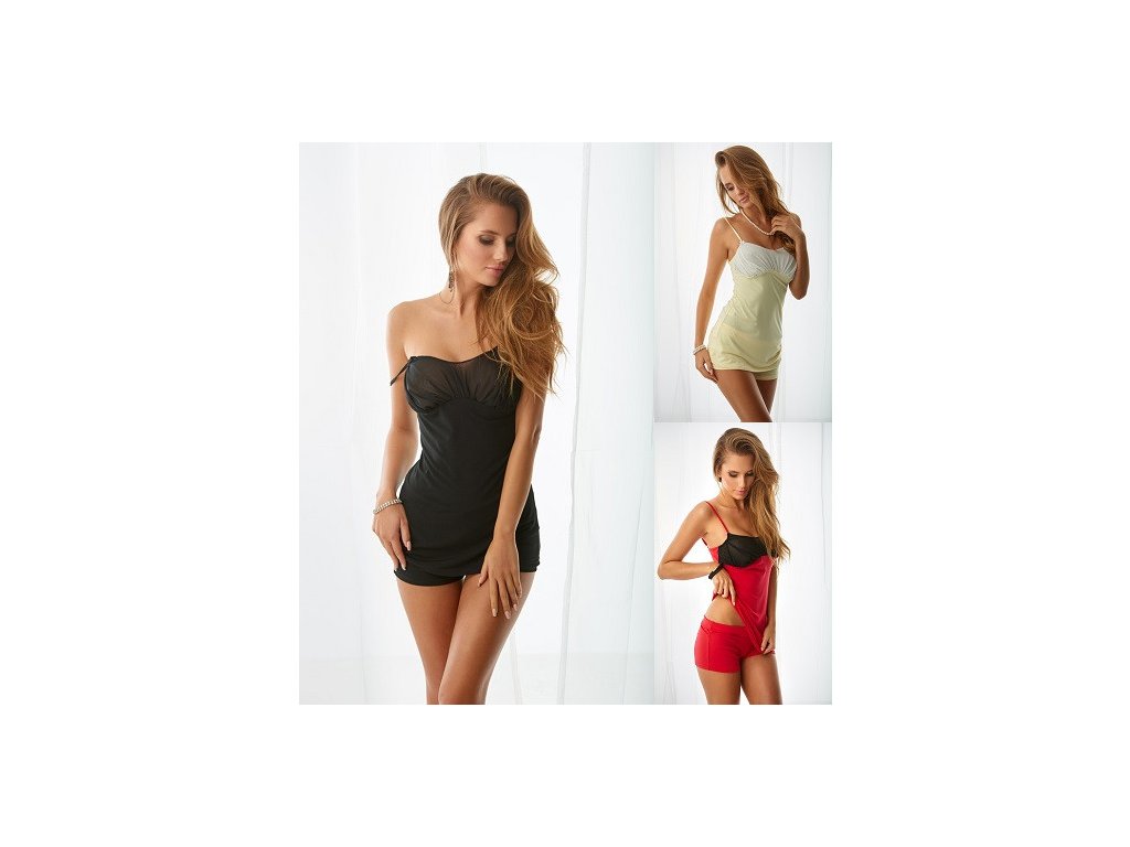 Červený dámský pyžamový komplet s tenkými ramínky. Dámský pyžamový komplet z příjemné, hebké elastické mikrofibry. Top červený v kombinaci s černým jemným tylem na předním dílu, vytváří ozdobný efekt push up. Zadní díl celý červený. Úzká nastavitelná ramínka zdobená koketními mašličkami. Červené kraťasy v pase na gumu, které ideálně ladí s košilkou a tvoří harmonický celek. Celková délka bočního švu košilky cca 45 cm. Délka kalhot 23,5 cm. Zboží je baleno v hezké dárkové krabičce, ideální na dárek.Doplňkové parametry