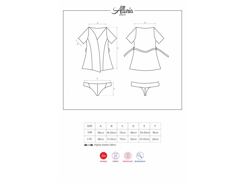 Alluria peignoirSmyslný outfit pro svůdnou ženu, jako jste vy? Stačí se podívat na tento! Alluria peignoir má všechny detaily, které se k Vám dokonale hodí. Úžasně jemný design bude krásně pokrývat Vaše tělo. Vše, co musíte udělat, je - obléci se a spustit fantazii na plno. Připravena?